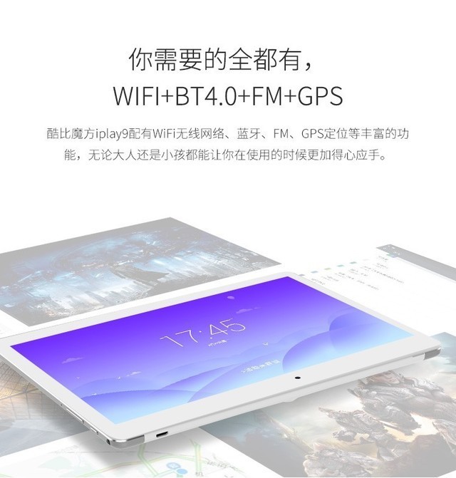 酷比魔方iplay9的硬件性能和超低功耗搭配出巨大的威力,4500毫安时的电池容量,让其在功耗与续航之间取得了黄金比例!iplay9采用的是安卓的4.4系统,系统较稳定,日常使用拿来追追剧或是打打小游戏不在话下,即使时下流行的王者荣耀也是可以带的动的。酷比魔方iplay9配有WiFi无线网络、蓝牙、FM、GPS定位等丰富的功能,无论大人还是小孩都能让你在使用的时候更加得心应手。