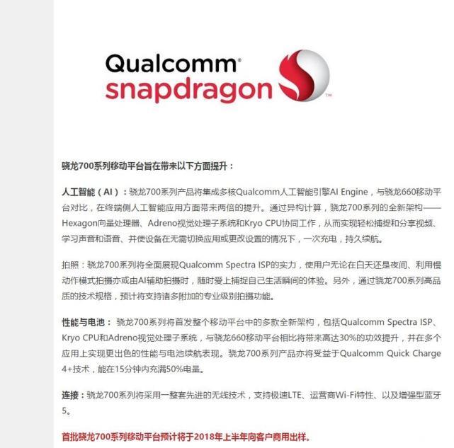 至于所谓的骁龙700系列处理器则据传是骁龙670更名而来,主要特色是相比骁龙660功效提升30%,AI性能提升两倍。虽然具体的构架和核心数量等规格尚未有确切的信息,并且高通给出的说法是骁龙700系列将于今年上半年首批出样商用,但从该款处理器发布时间点来看,或许确实存在OPPO R15系列首发的可能性。